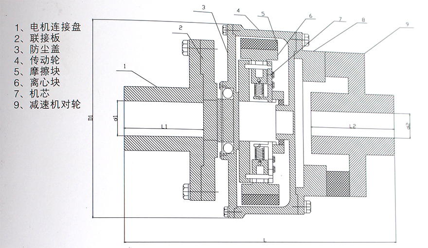 本产品主要利用了转动物体的离心原理,电动机转动时,带动偶合器机芯一起转动,装在机芯槽中的离心摩擦块在离心里的作用下与传动轮内壁涨紧以输出力矩,带动工作机,电机起动时。机芯空运转。当电机转速达到500—700R/MIN,离心摩擦块克服拉簧拉力轻贴传动轮内壁。电机达到额定转速时,机芯与电动机同步运转,离心摩擦块与传动轮内壁完全接触并涨紧,由传动轮上花键套带动减速器输入轴运转。当工作机严重超载时,离心摩擦块在传动轮内打滑,保护电机及机械设备。